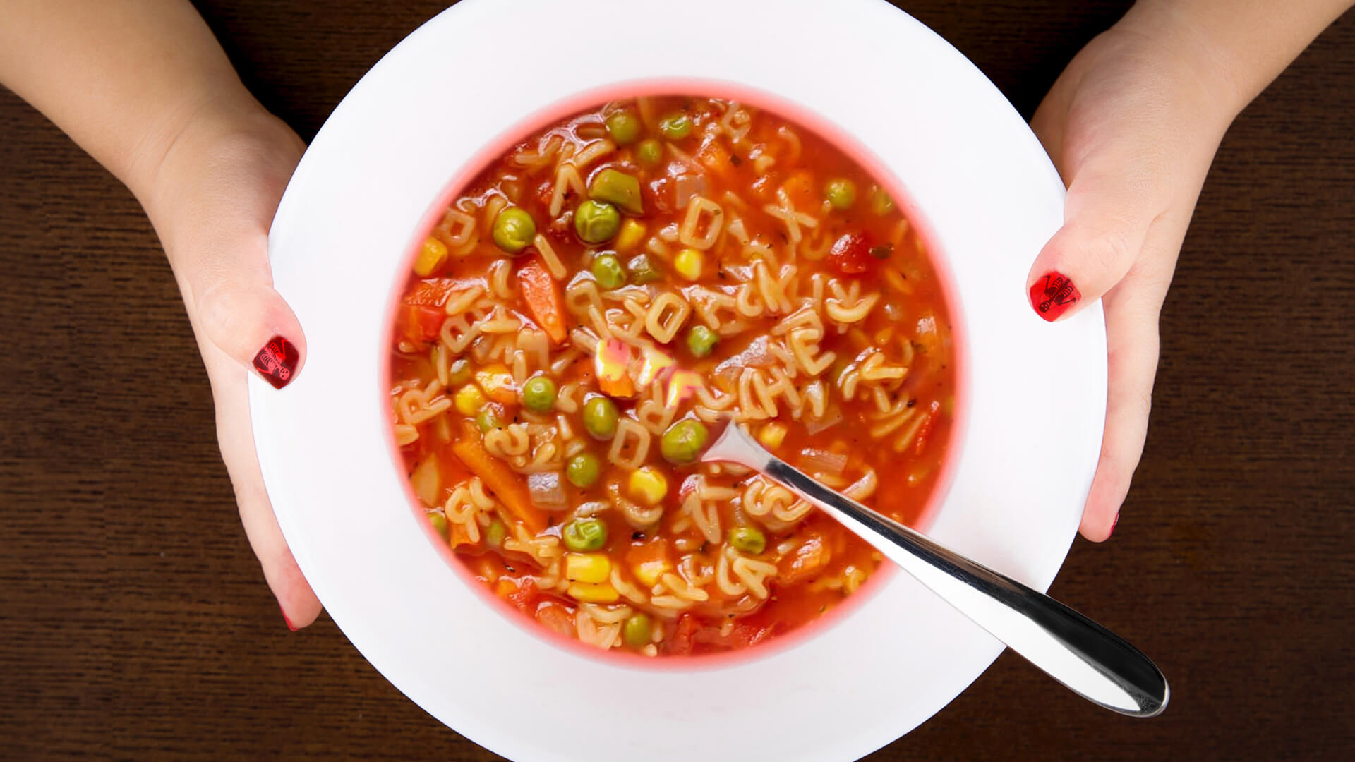 Ofuscado, se abalanzó sobre la sopa y movió las letritas de pasta hasta formar un mensaje para Auxibio: no vever.